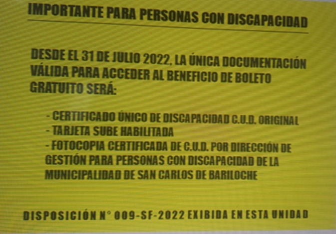 Reiteran información relativa a la documentación que permite acceder al boleto gratuito para personas con discapacidad